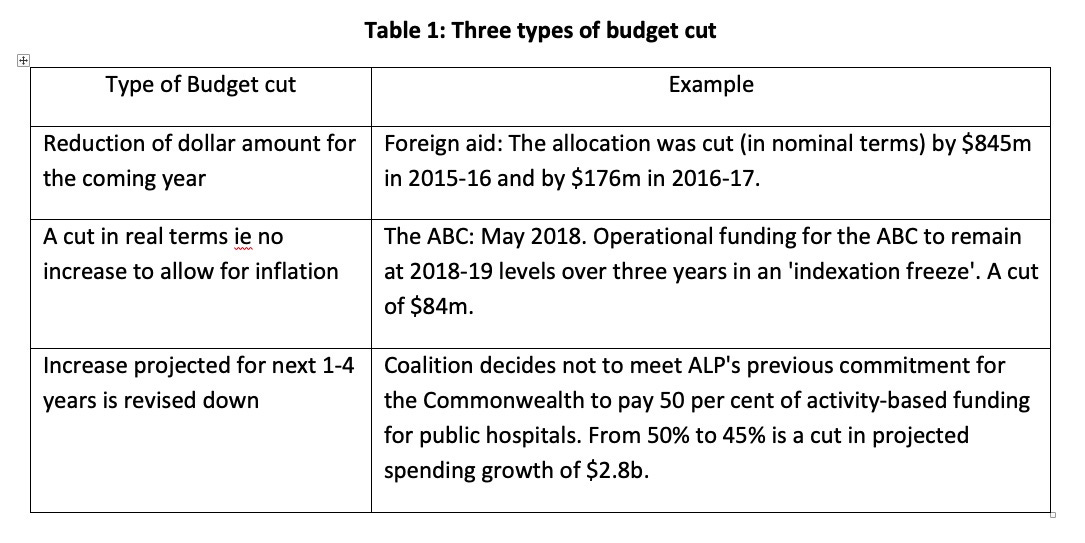 As has been explained elsewhere, conflicting dollar figures about ‘cuts’ can arise simply because of the selection of different things to measure and through the attribution of particular meaning to words like ‘cuts’. The context for different claims is the quite complex system of Federal Budgets, and both sides of politics can benefit from a continuation of the misunderstanding so are not always disposed to clarify matters.