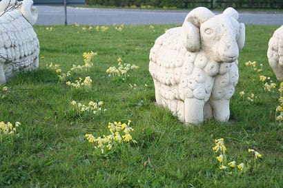 Later on during that same trip those first photos become immaterial. I cause some confusion for other drivers at a junction near Shepton Mallet (Babycham anyone?) by circumnavigating a roundabout on which grows a fine crop of cowslips guarded by a flock of concrete sheep.