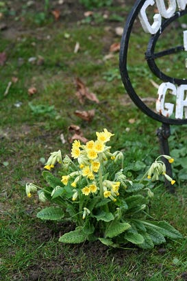 Visiting the UK in 2011 we happen upon a very small clump of cowslips in a suburban gateway. I insist on photographs.