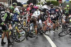 The Tour leader’s crash came with 11km to go. His front wheel slipped on a white line on a left-hand bend shortly before the foot of the drop down from Megève to the valley before the final first-category ascent to the finish. He brought down Vincent So Italy (A Stunner) with him.